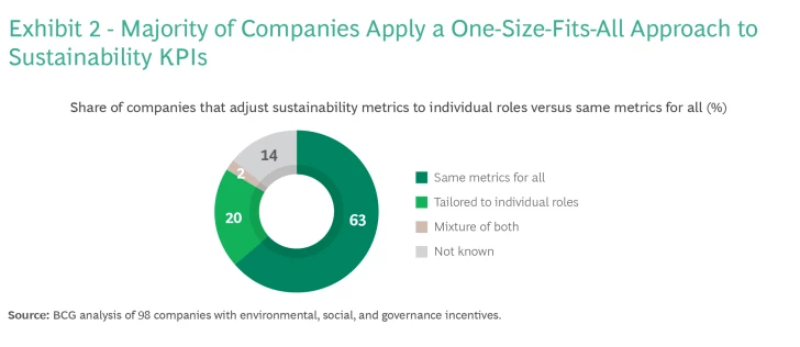 Low Weight.In our benchmark, sustainability incentives most frequently account for only 10% to 20% of the total incentive pool, with an even smaller percentage per specific metric. Such allocations are unlikely to drive substantial behavioral changes.
